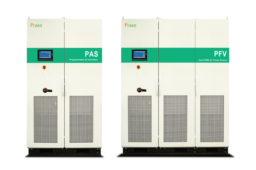 PAS 系列單機(jī)輸出功率可達(dá)200??0kVA,PFV 單機(jī)輸出功率可達(dá)400??kVA,輸出電壓范圍皆為0-300V,輸出頻率為45-65Hz 連續(xù)可調(diào)或選配40-70Hz 連續(xù)可調(diào),通訊介面為RS-485 / RS-232 或選配GPIB、Ethernet、USB,更有標(biāo)配或選配的三相獨(dú)立可調(diào)、相位角可調(diào)、及能源回饋功能。